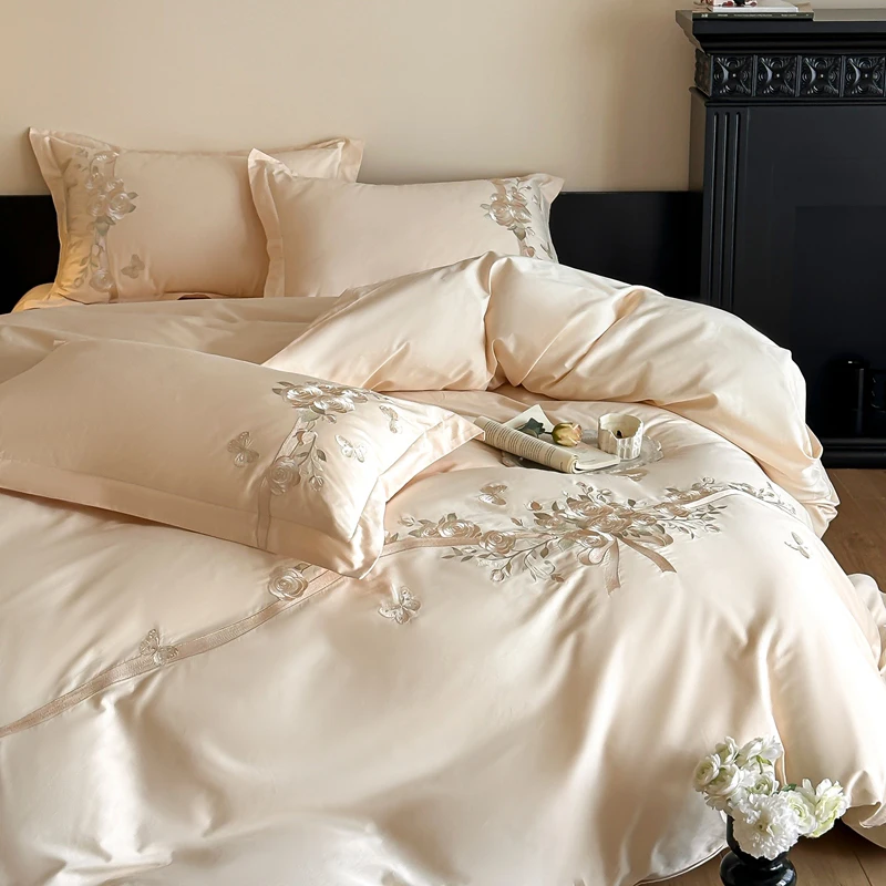 100% Cotton Luxury Rose Flowers Embroidery Bedding Queen King Size Duvet Cover Set Flat/Fitted Bed Sheet Pillowcases 4Pcs