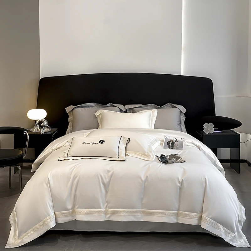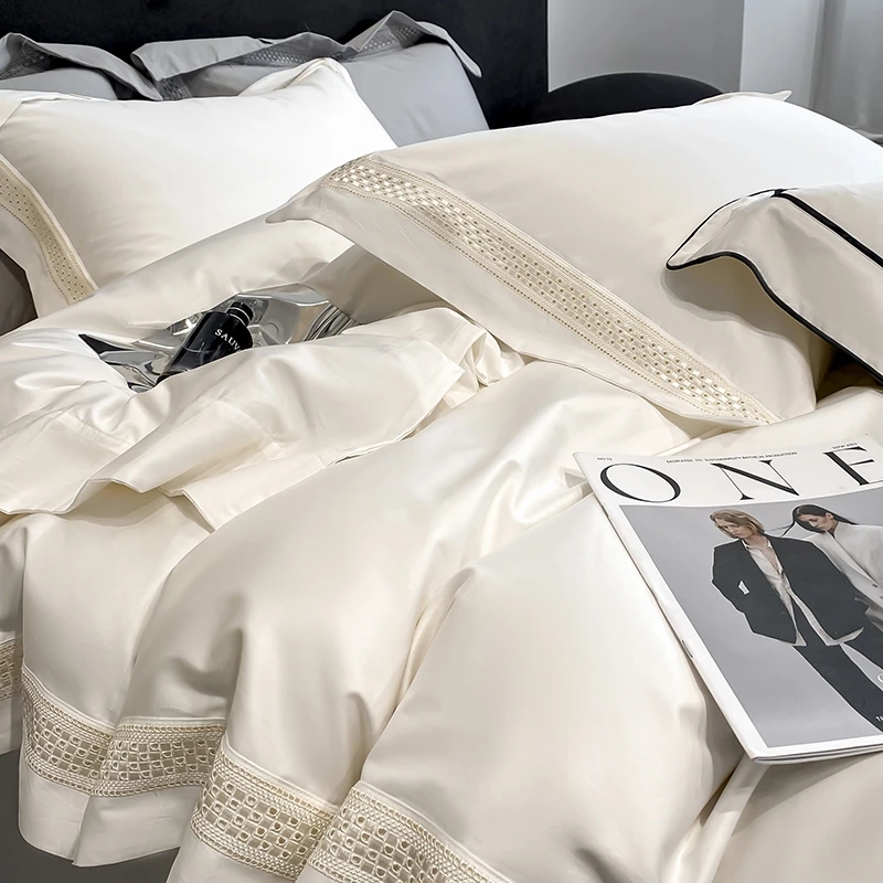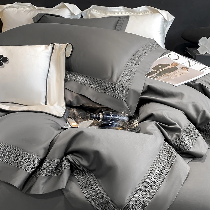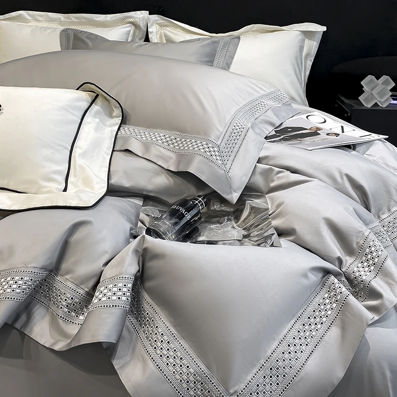 Egyptian Cotton Hollow Edge Luxury Bedding Set, White, Grey, Pink, Blue,1 Duvet Cover,2 Pillowcases,1 Flat Sheet Or Fitted Sheet